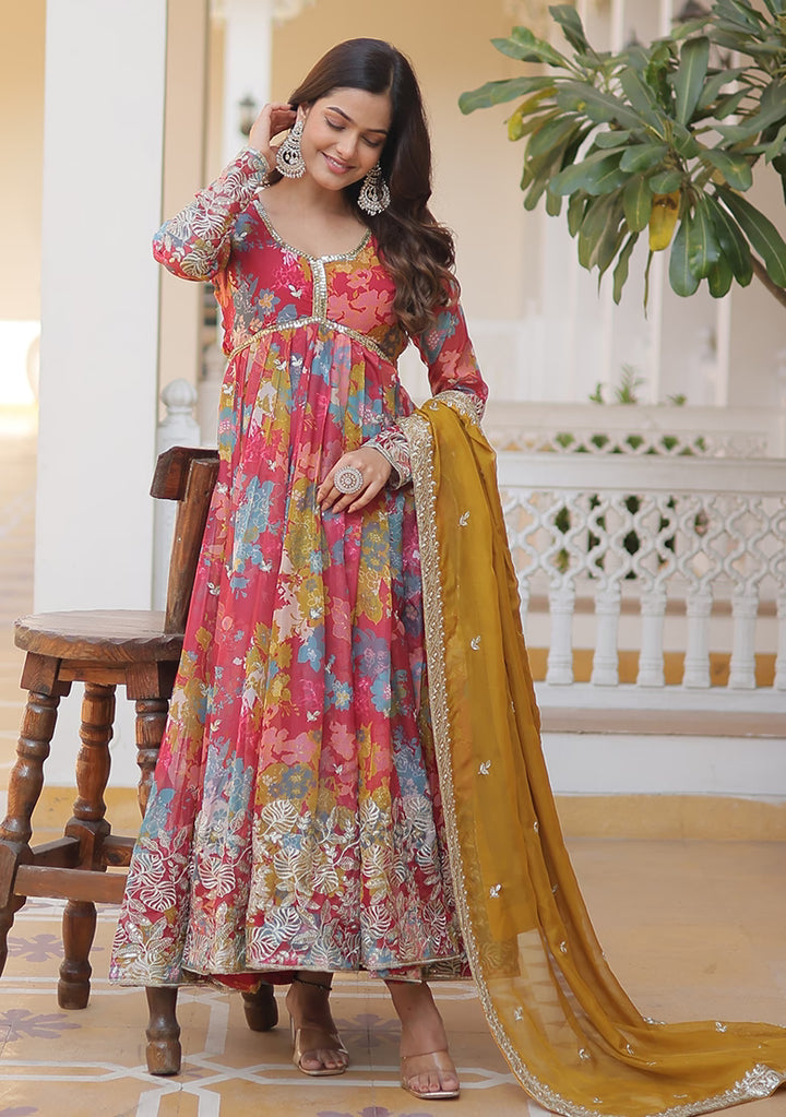 Elevate your ethnic wardrobe with this exquisite Pink Zari Sequin Embroidered Russian Silk Anarkali Set. Crafted from premium Russian silk, this ensemble features intricate zari and sequin embroidery that catches light beautifully. The classic Anarkali silhouette offers timeless elegance with a flattering, flowing fit perfect for weddings, celebrations, and special occasions. The delicate embellishments showcase masterful craftsmanship, while the luxurious fabric ensures comfort and a refined drape. An investment piece that combines traditional artistry with contemporary sophistication.